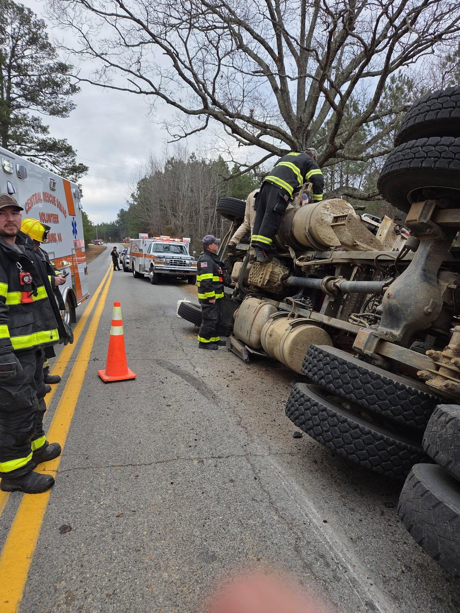Fire crews arrived to find a single-vehicle crash with the log truck overturned. The fire department said the driver was assisted out through the windshield area by a passerby before responders arrived.