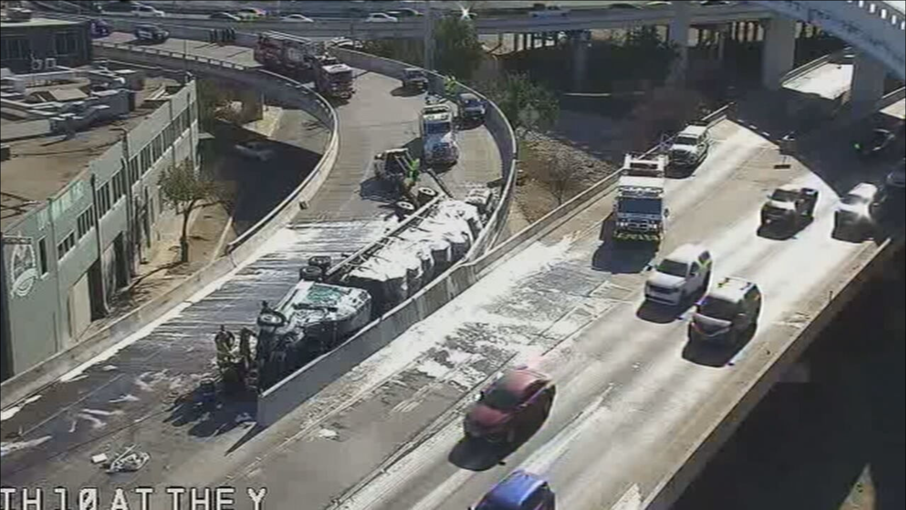 SAFD said the tractor-trailer was hauling a load of bees when it overturned. The driver was transported to a hospital with minor injuries as a precaution, officials said.