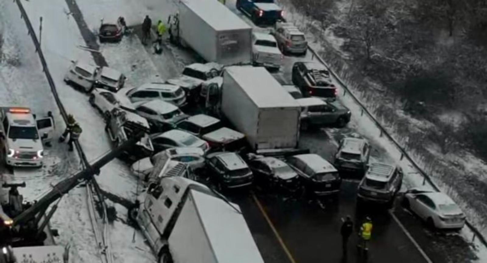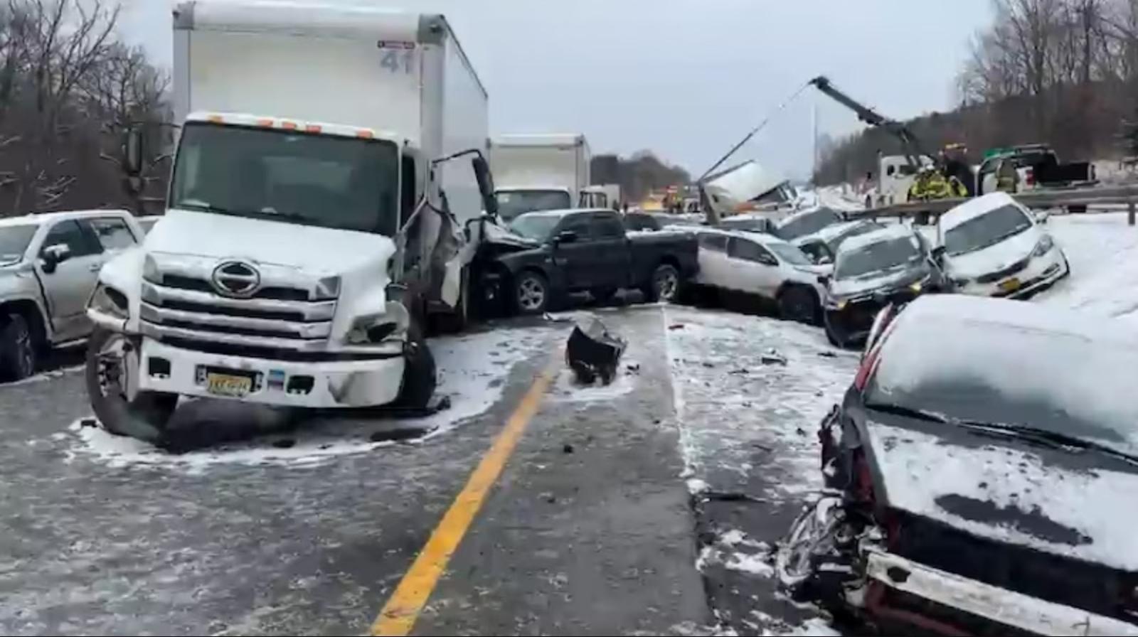 State police said the crash happened around 2:20 p.m. near Exit 73 and ultimately involved 37 vehicles. Authorities said four people were taken to Crouse Hospital and three to Upstate University Hospital in Syracuse. Troopers said two people sustained serious but non-life-threatening injuries.