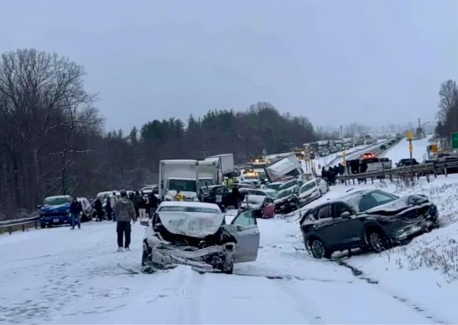 LAFAYETTE, NEW YORK — A massive snowstorm pileup involving 37 vehicles — including three tractor-trailers — snarled Interstate 81 near Exit 73 in LaFayette Thursday afternoon, sending seven people to hospitals and forcing uninjured motorists to be transported from the scene, state police said.