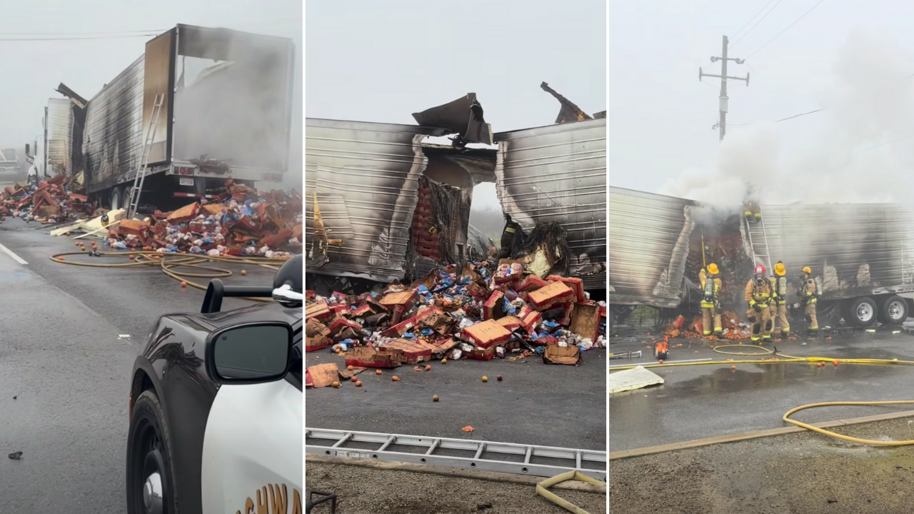 Authorities said the impact caused the pickup’s cab to become lodged beneath the semi’s trailer. The truck and trailer then caught fire, sending black smoke into the air.