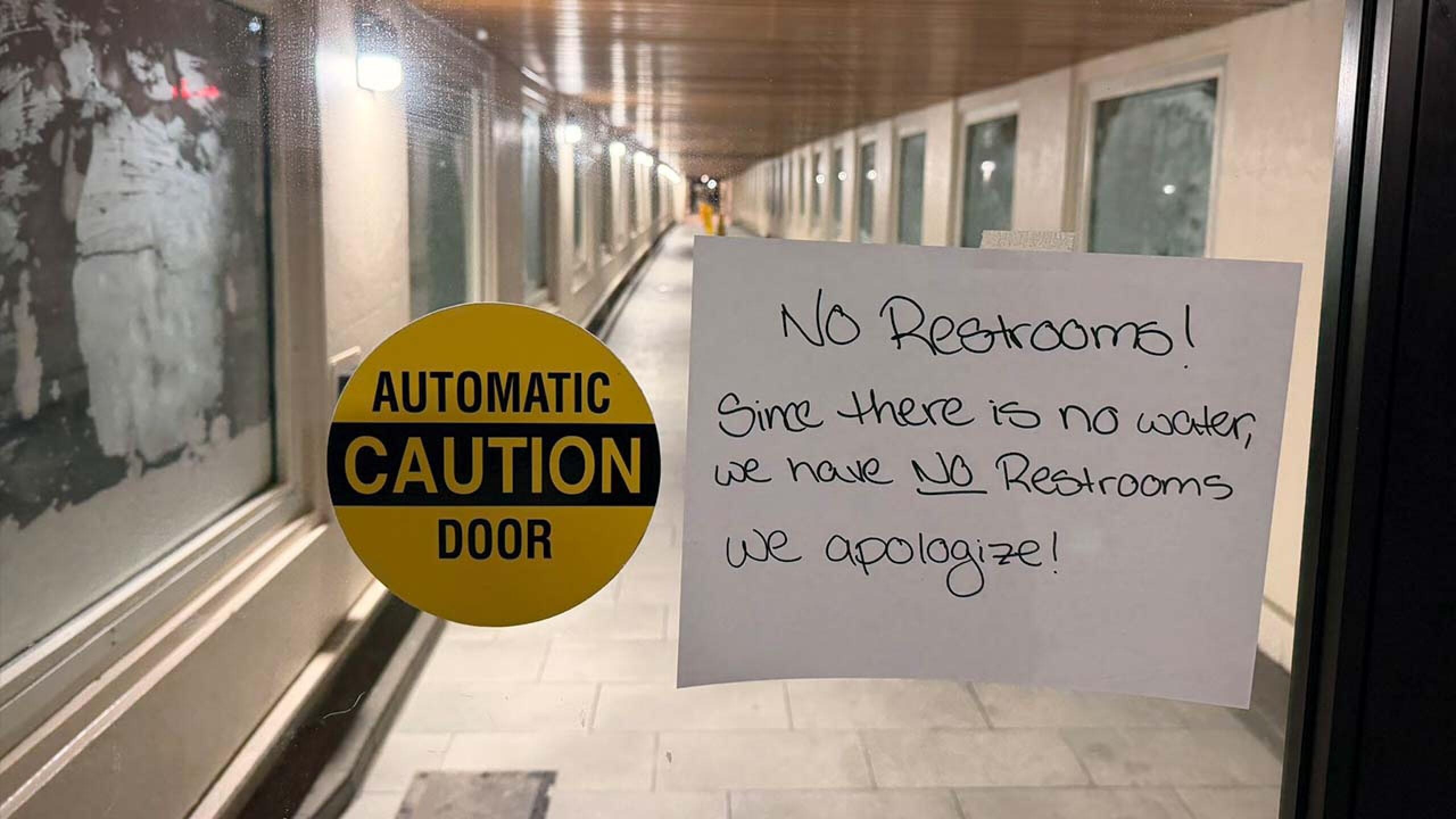 Travelers also temporarily lost access to restrooms after the service area’s water supply was cut off. Photos from the scene showed signage on the bathroom entrance stating: “No restrooms! Since there is no water, we have no restrooms. We apologize!”