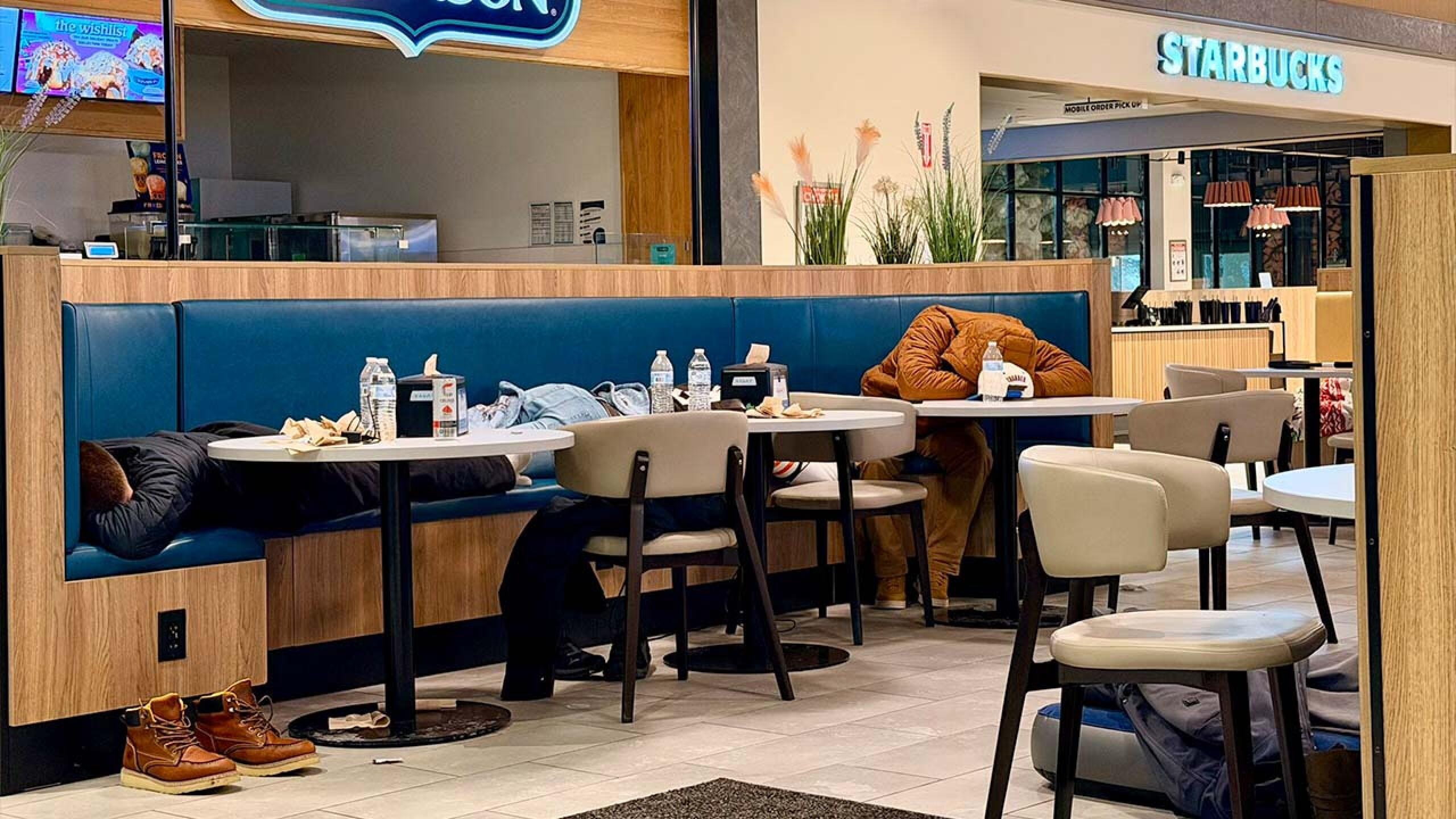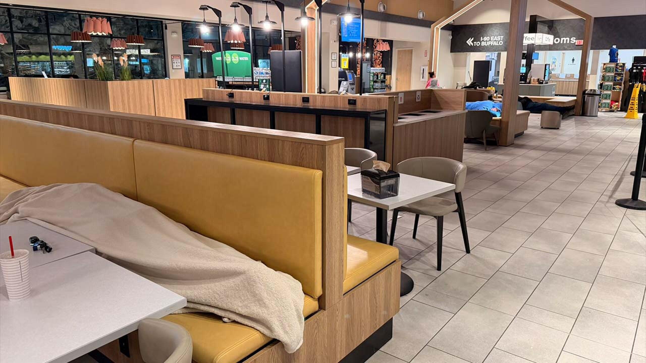 Roughly 40 people stayed in the service area’s food court overnight because the parking lot and access road were not plowed and traffic became gridlocked as more vehicles pulled in. Chenelly said multiple trucks stopped, which ultimately clogged access to the gas pumps and exits, preventing drivers from leaving.