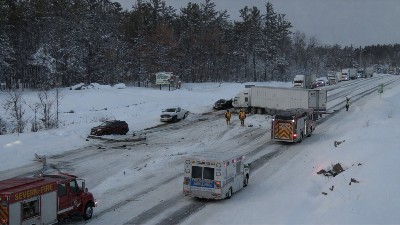 WASHAGO, ONTARIO — Hundreds of motorists were left stranded on Highway 11 north of Orillia after a tractor-trailer reportedly smashed through a median barrier and jackknifed, triggering a multi-vehicle crash and forcing a major closure, according to Orillia OPP.