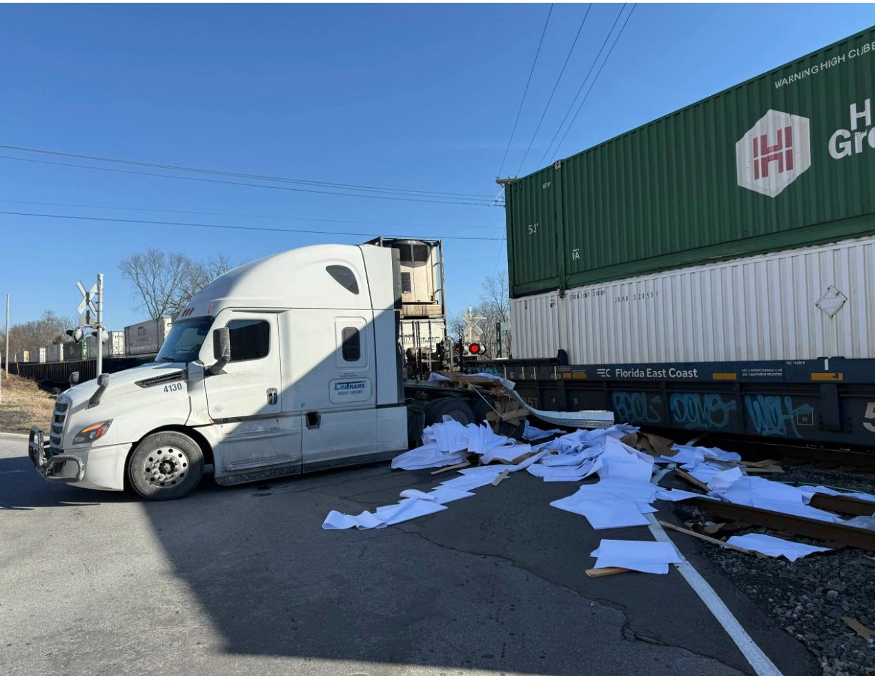 According to the Greeneville Police Department, dispatchers received a call at approximately 10:24 a.m. reporting a semi-truck stuck on the West Irish Street railroad crossing near the intersection with Railroad Street. Police said a train hit the truck before responding officers arrived.