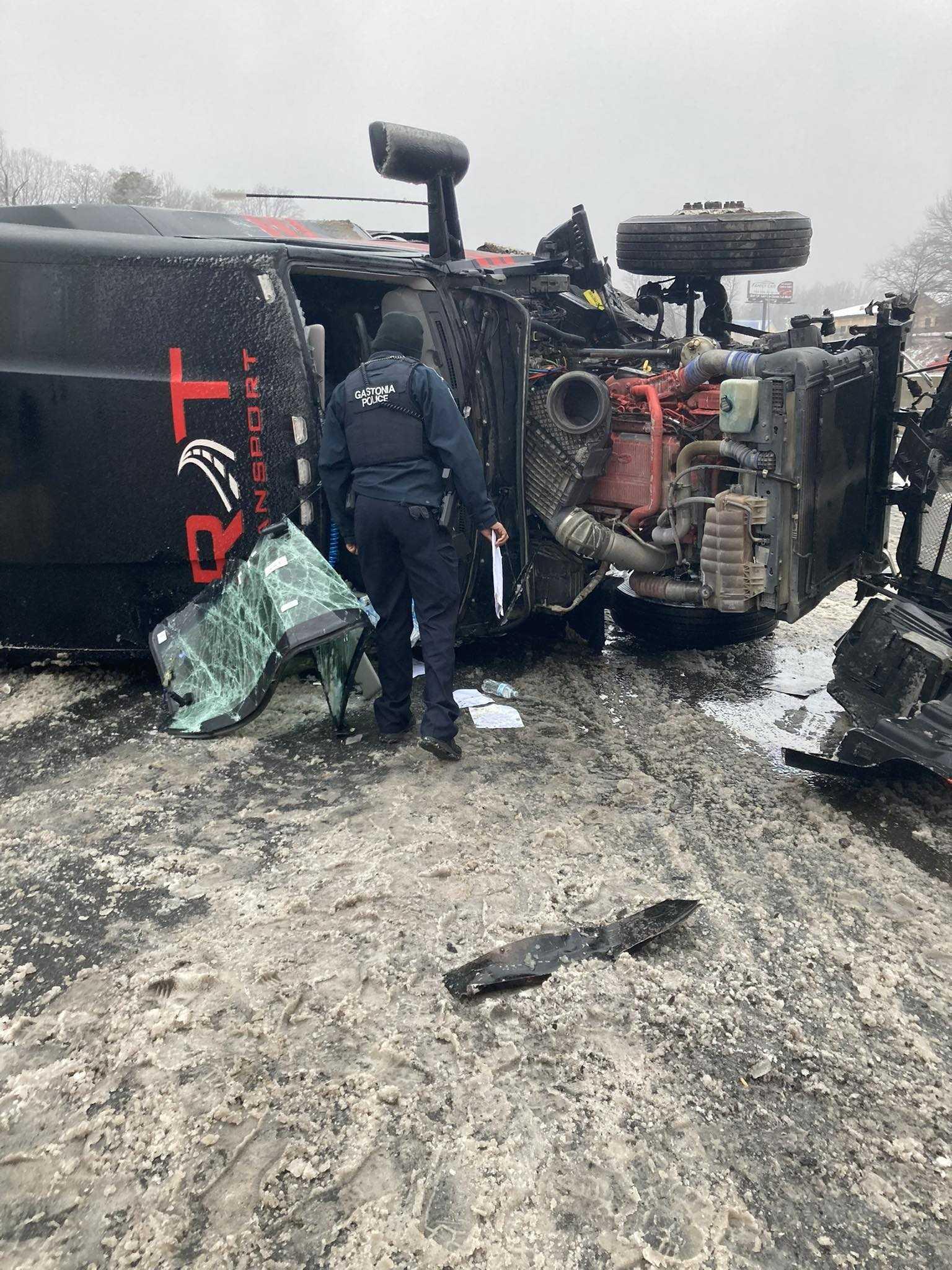 The Gastonia Police Department said the semi overturned while traveling through hazardous road conditions linked to the ice storm. No injuries were reported, and drivers were urged to avoid the area during the closure.