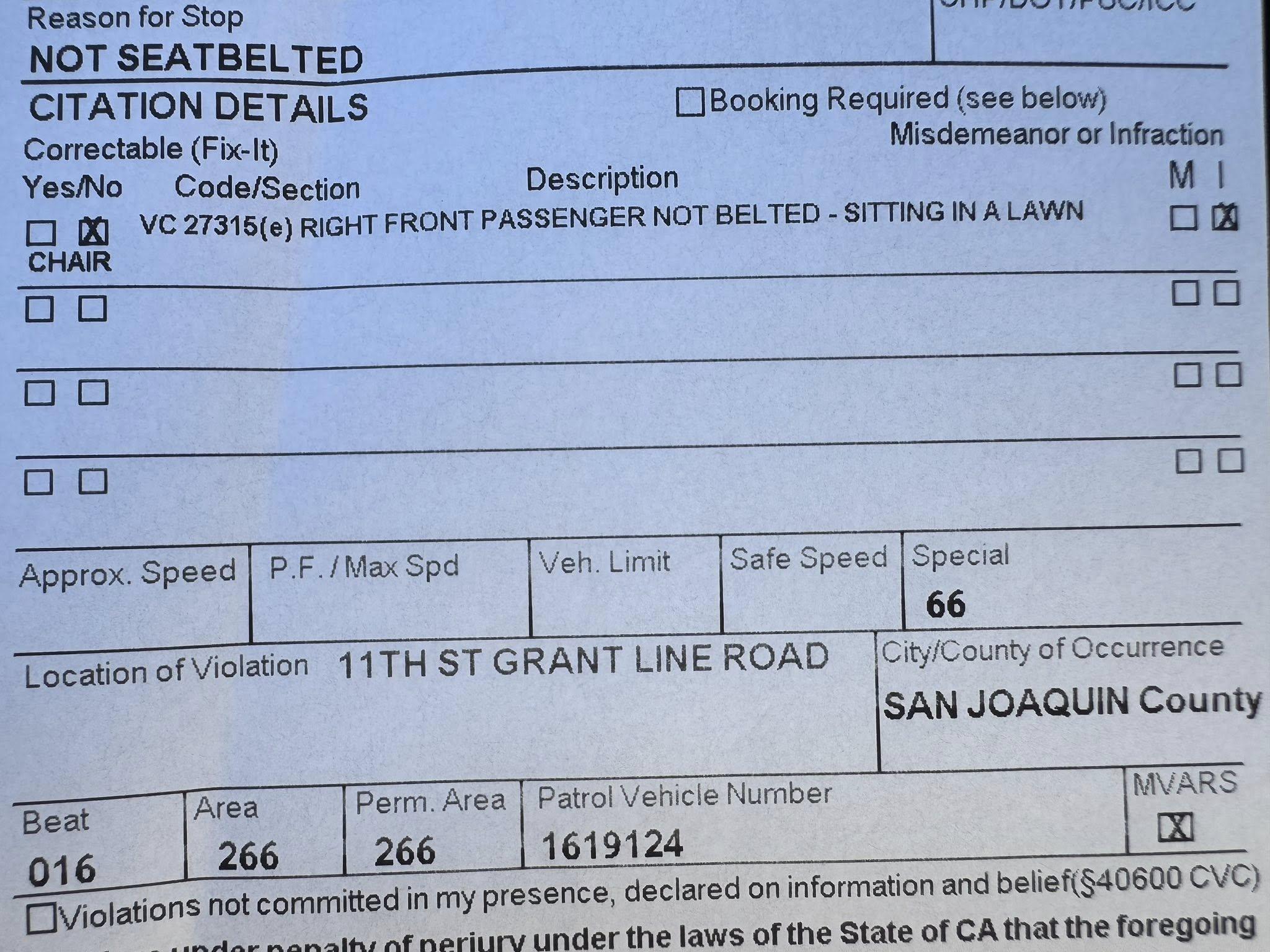 CHP said the traffic stop occurred on Jan. 24, 2026, at the intersection of 11th Street and Grant Line Road. Troopers reported the right-front passenger was seated in a folding lawn chair and was not wearing a seatbelt.