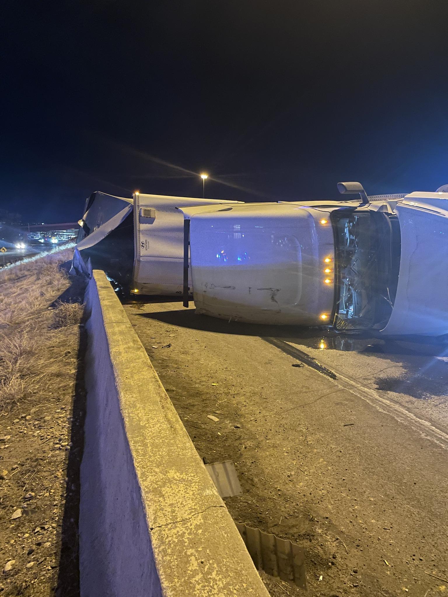 Police said the crash happened around 11 p.m. when the truck suffered a tire blowout and overturned on the ramp. The driver was transported to the hospital, though officials did not release an update on the driver’s condition as of Thursday morning.