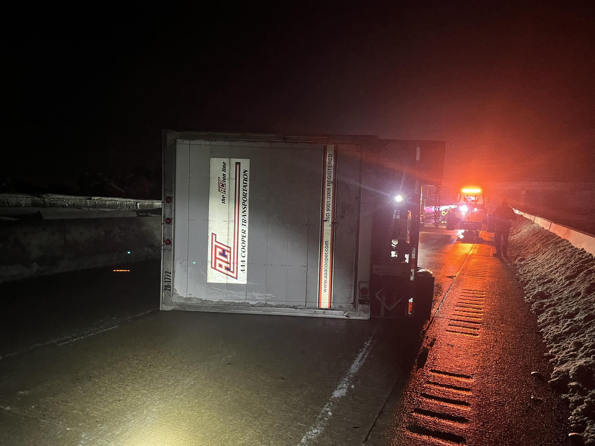A semi-truck hauling a trailer then lost control while attempting to avoid the pickup and trailer, and its trailer disconnected and tipped over onto the roadway. A second semi-truck, also hauling a trailer, went off the roadway into a ditch to avoid crashing into the other vehicles involved, according to police.