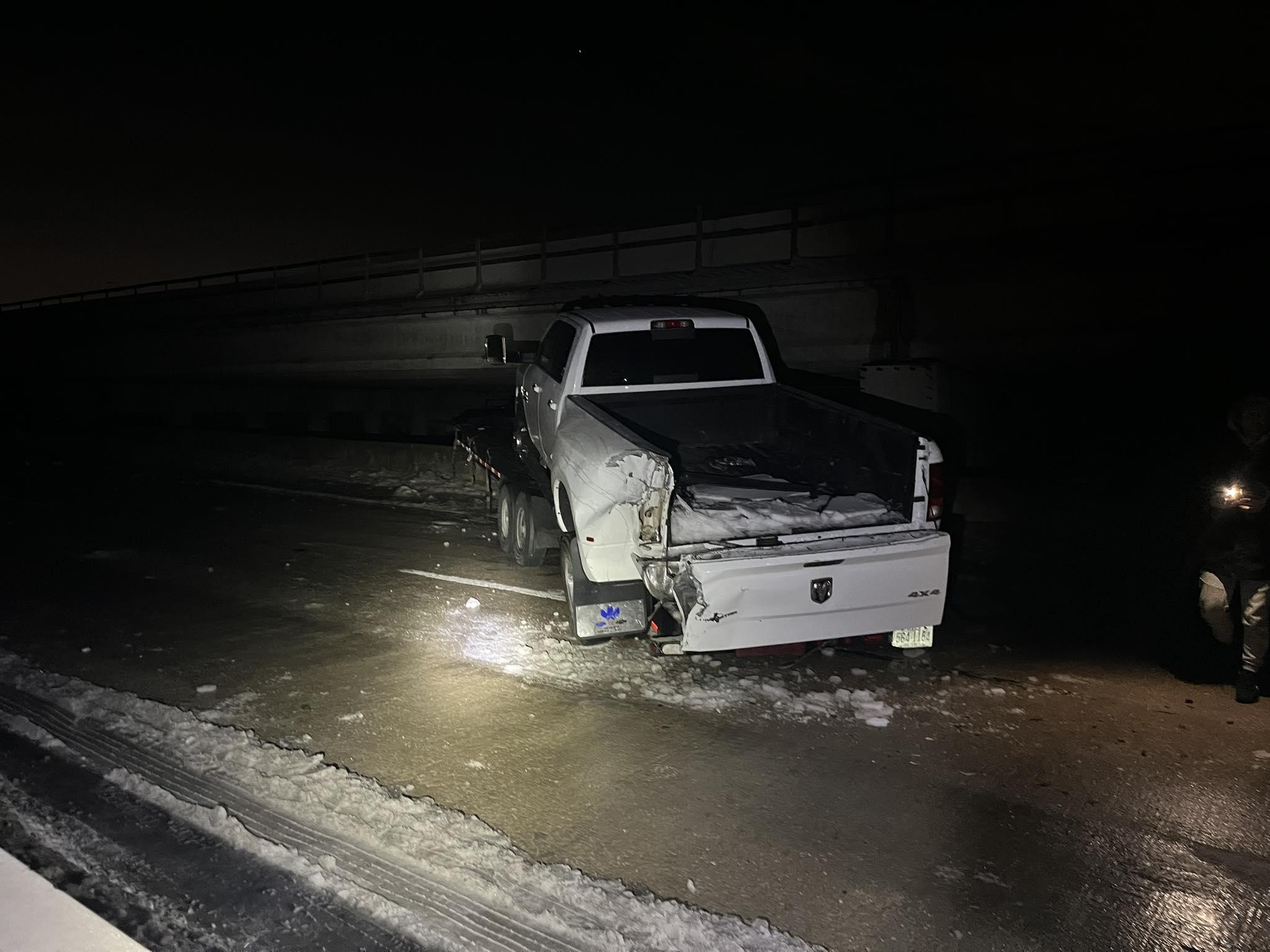Pickup Crash Triggers Chain Reaction With Two Semis, Leaving Trailer Dangling From Bridge
