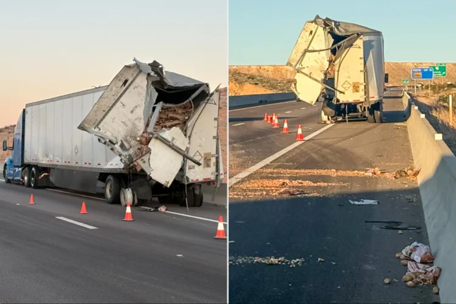 During the crash, one of the tractor-trailers spilled its load — about 76,000 pounds of potatoes — across the freeway. Cleanup crews responded and removed the debris, and by about 8 a.m. local time, the potatoes had been cleared and all lanes reopened.