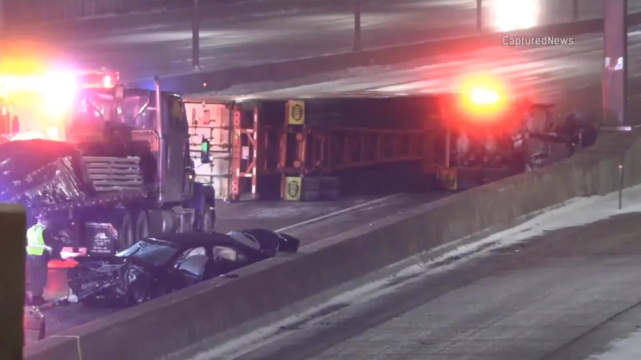 Illinois State Police said a semi-trailer truck struck the vehicle involved in the earlier crash, then rolled onto its side, pushing that vehicle into the EMS worker. The EMS worker sustained injuries that were described as severe (initially reported as non-life-threatening but serious) and was taken to Advocate Lutheran General Hospital in Park Ridge, a Level 1 trauma center.