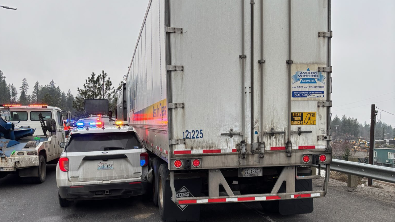 Trooper’s Cruiser Hit by Semi on Spokane I-90 Off-Ramp After Driver Tries to Squeeze By on the Right