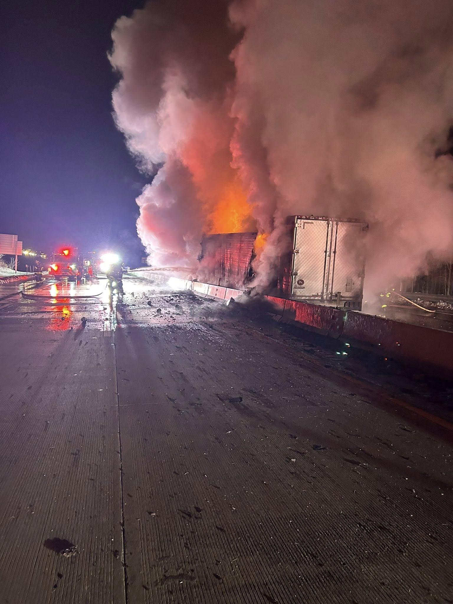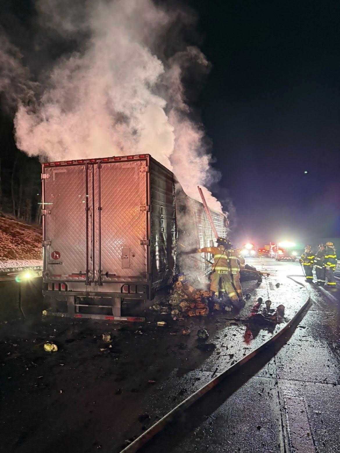 The Fort Allen Volunteer Fire Company said crews arrived to find a semi-trailer fully engulfed in flames, and noted one of the trucks involved appeared to be hauling produce. Photos from the scene showed heavy debris and extensive damage across the roadway.