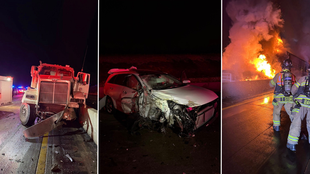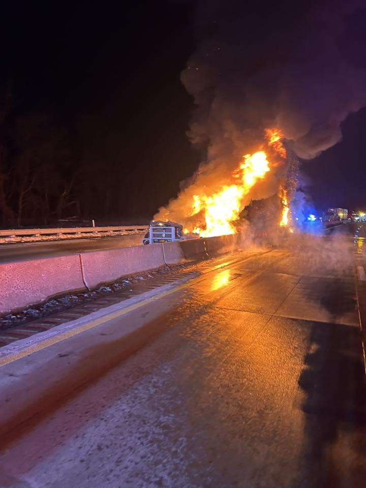 The crash happened shortly after 12:30 a.m. Tuesday near the Yukon exit (Exit 54), with responders reporting a multi-vehicle scene involving an SUV and three tractor-trailers. The New Stanton Volunteer Fire Department said the collision caused a fuel spill, which then ignited, leaving at least one truck burning.