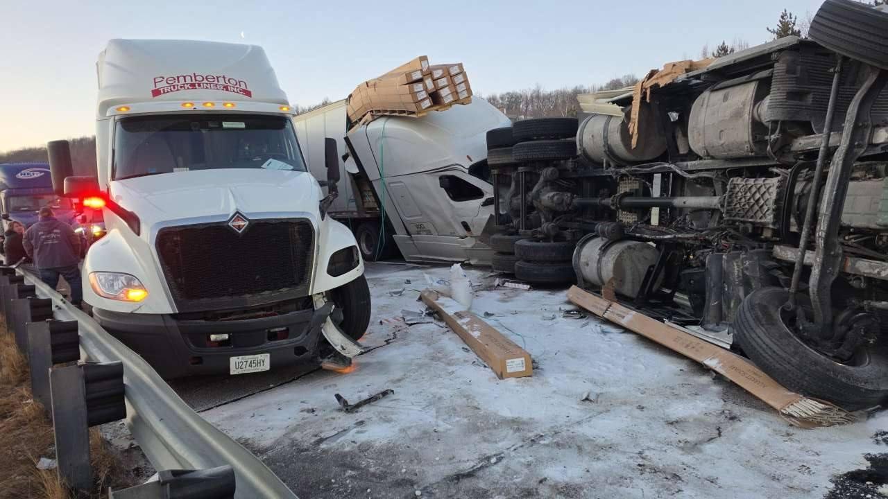HIXTON, Wisconsin — A crash involving three commercial semi-trucks shut down westbound Interstate 94 for nearly four hours Wednesday morning, leaving one driver with life-threatening injuries.