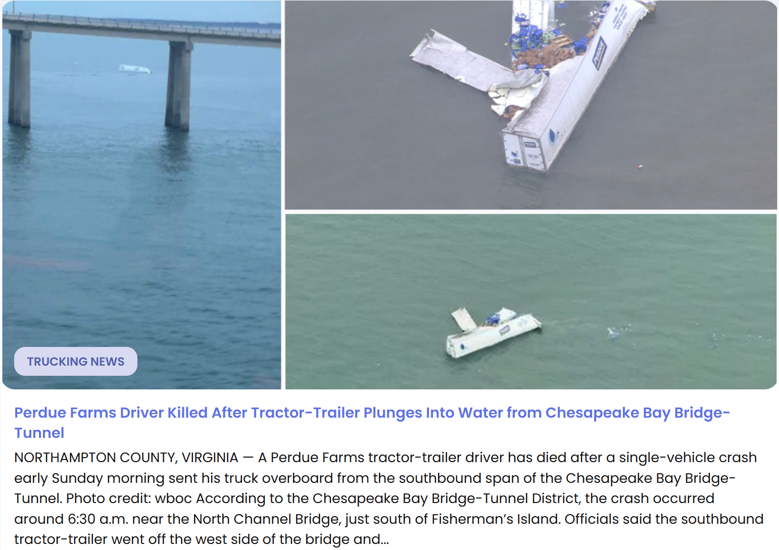 “We are heartbroken to confirm that a Perdue driver has passed away following an accident on the Chesapeake Bay Bridge-Tunnel. Our thoughts and deepest condolences are with his family, friends, and loved ones during this incredibly difficult time. He had been a valued member of our team, and his loss will be deeply felt across our organization. We are cooperating fully with authorities as they continue their investigation.”