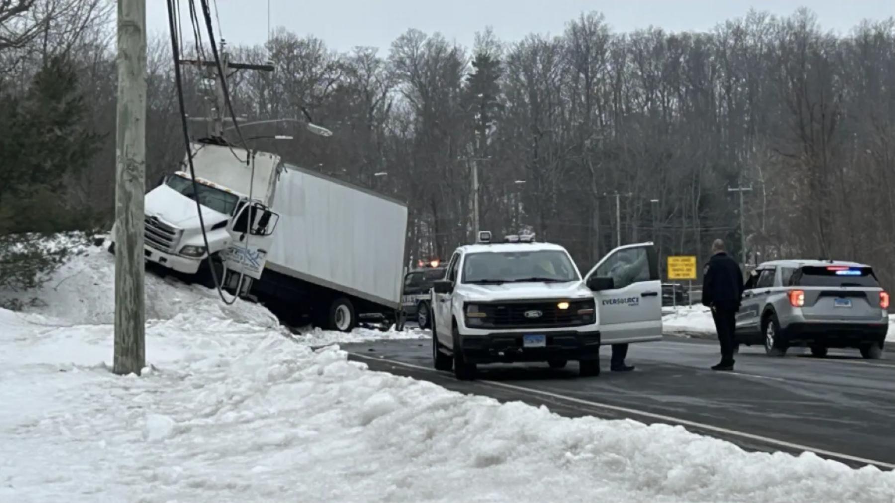 Officers responded around 9:03 a.m. to the area of Albany Avenue for reports of a single-vehicle crash. Police said a 2020 Hino box truck was traveling eastbound when it struck the south side guardrail, veered off the roadway, crashed into a utility pole and ultimately came to rest on a rocky, snow-covered ridge along the roadside.