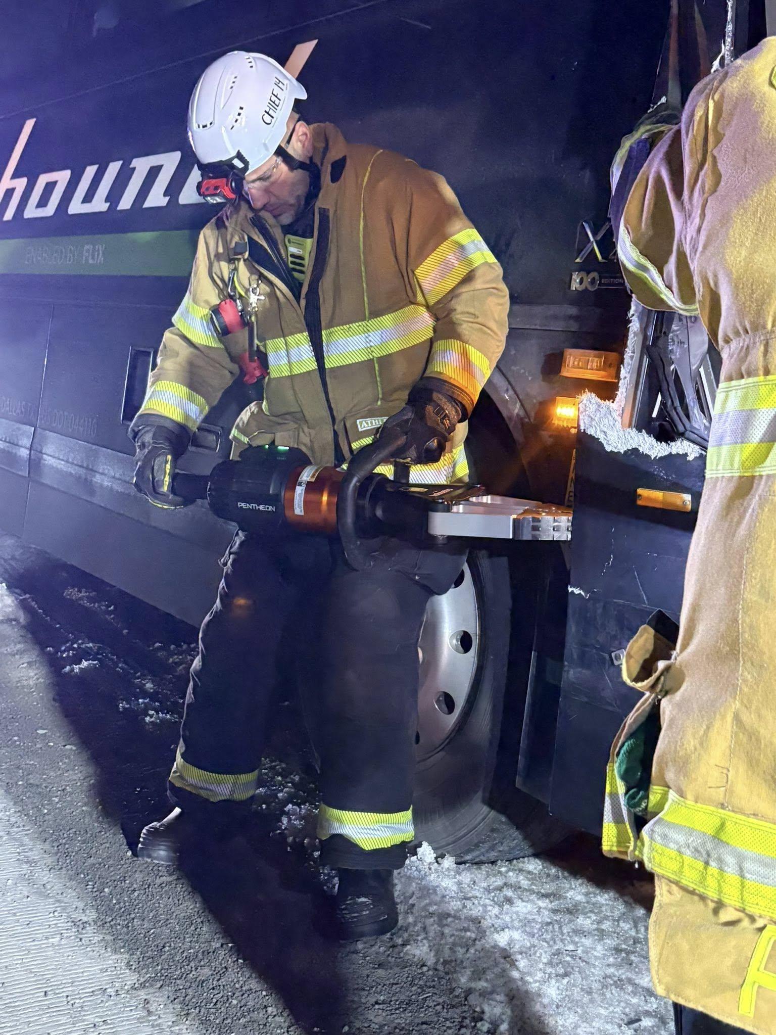 Rescue crews deployed the full complement of Holmatro Pentheon battery hydraulic tools to cut through the entanglement and steel structure of the bus door, allowing EMS to access injured passengers while enabling those uninjured to exit the vehicle. "Even with the level of entanglement and strength of the steel structure of the bus and door, the Holmatro tools made quick and easy work of the task," Covington Independent Fire Company said.