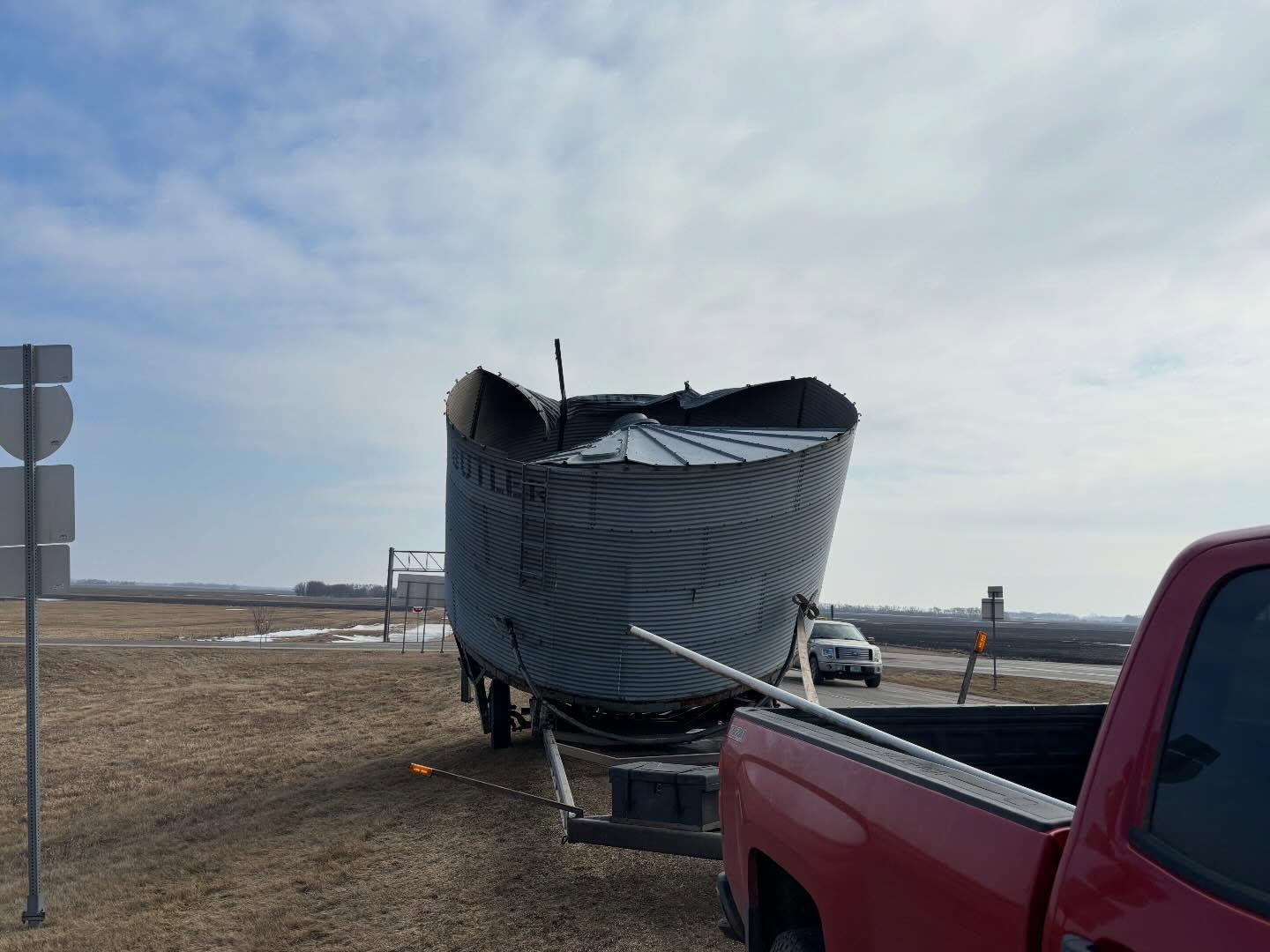 North Dakota Highway Patrol Reminds Drivers That Loads Over 14 Feet Require a Permit After Pickup Hauling Oversized Bin Strikes and Damages Highway Sign