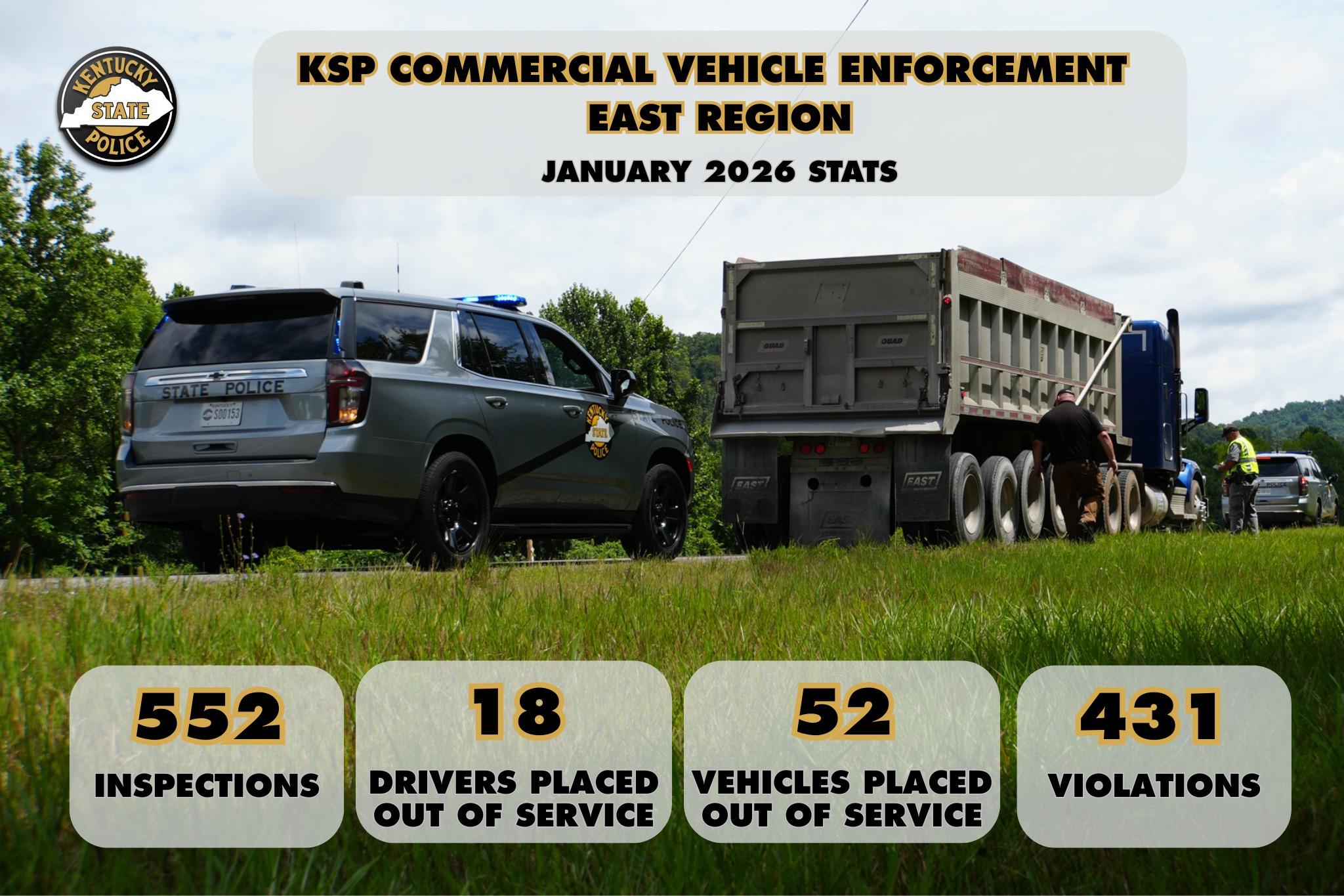 KSP East Region troopers conducted 552 commercial motor vehicle inspections in January, citing 431 violations. A total of 18 drivers and 52 vehicles were placed out of service during the month. A vehicle being placed out of service means a safety issue was found that had to be corrected before the commercial vehicle could return to the road.