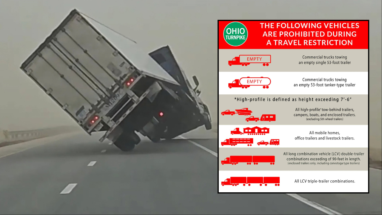 The Ohio Turnpike will remain open for passenger vehicles and most commercial vehicles during the restriction period. The restrictions target high-profile vehicles most susceptible to high wind speeds.