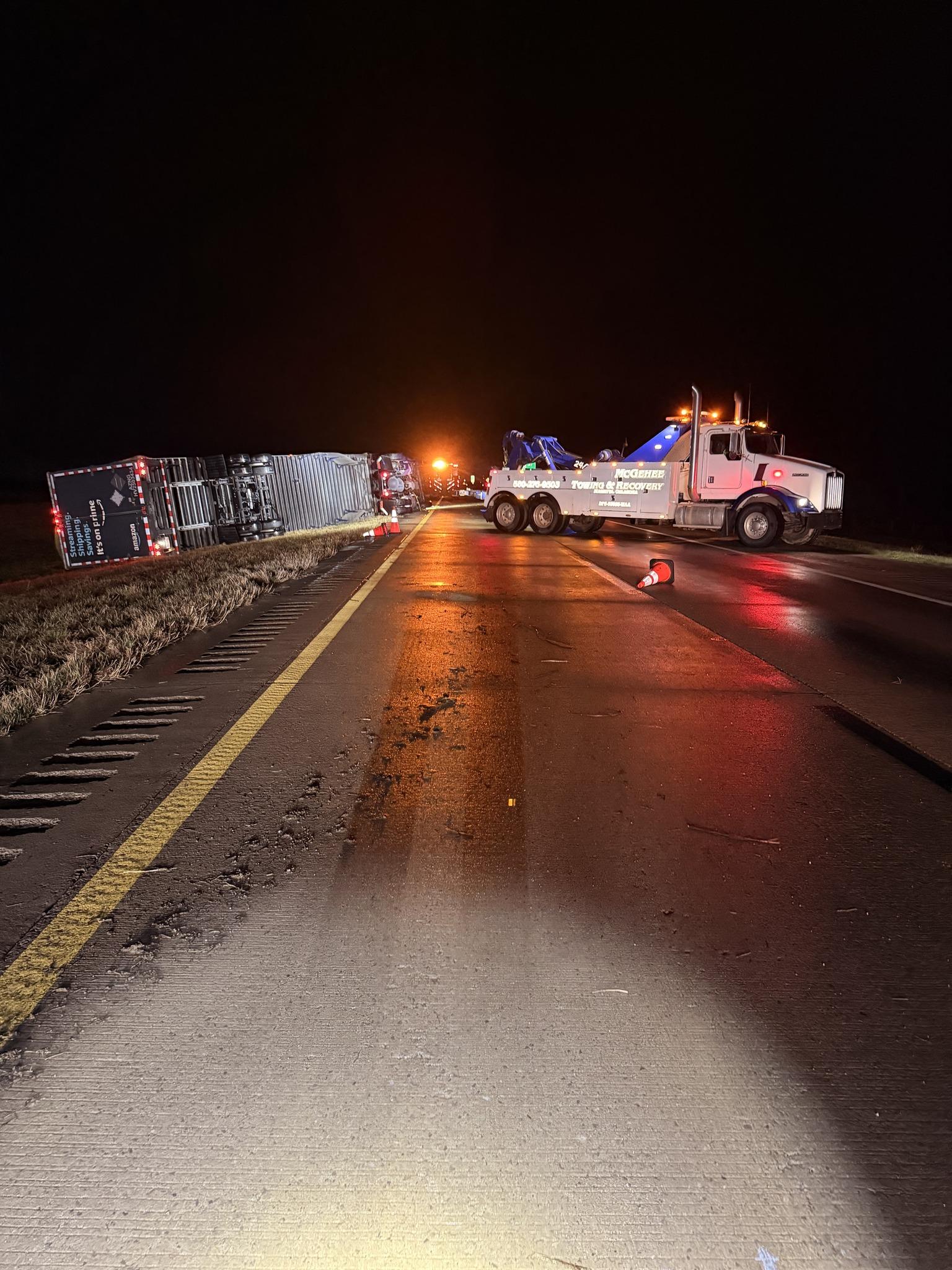 LOVE COUNTY, OKLAHOMA — Three tractor-trailers were blown over by high winds on southbound Interstate 35 near mile markers 14 and 15 in Love County last night, with one driver transported to the hospital with injuries expected to be non-life-threatening.