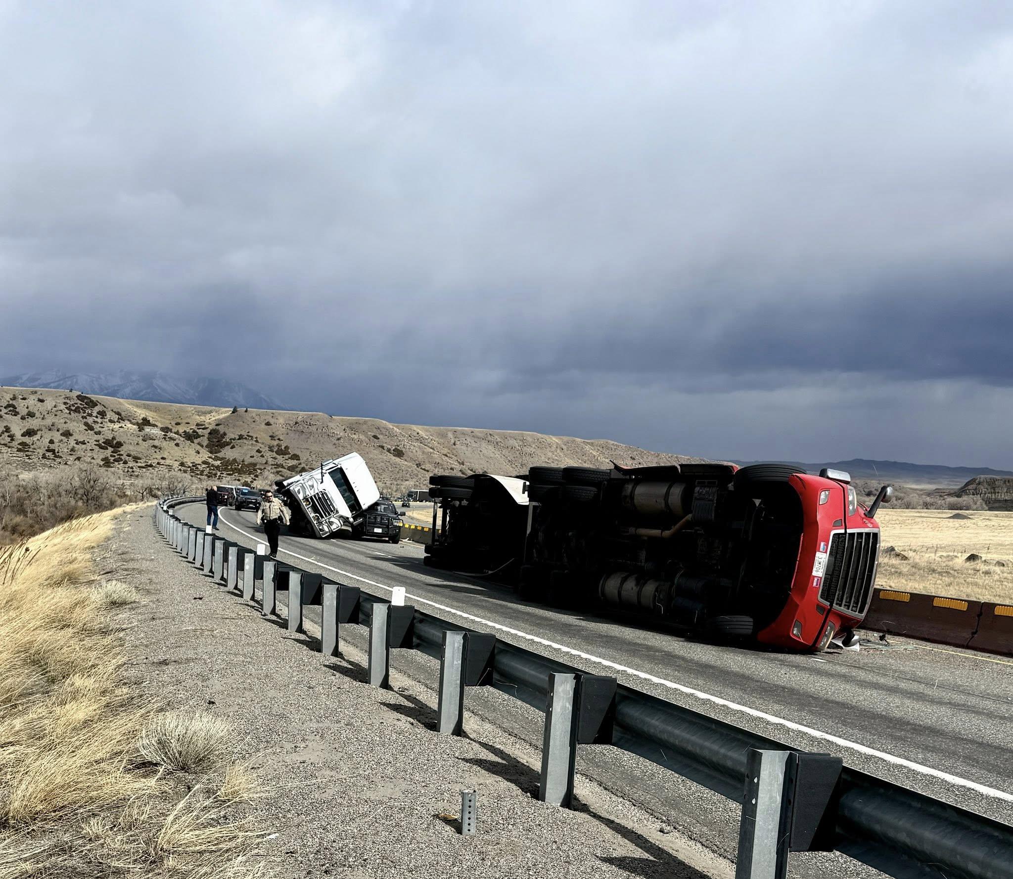 On March 12, 2026, the Park County Sheriff's Office, Montana Highway Patrol, and Park County Rural Fire responded to westbound I-90 at mile marker 350 for a report of a semi truck that had been blown over by high winds. While deputies and first responders were on scene, a second semi truck was blown over by the wind and landed on top of the deputy's patrol vehicle, with the deputy still inside.