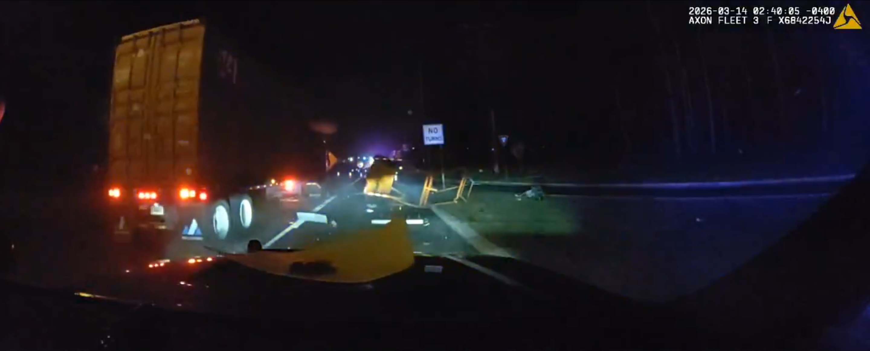 The crash occurred at approximately 2:40 a.m. on March 14, 2026, in a construction area on Route 1 near the Plainsboro border in Middlesex County. According to Deputy Police Chief Jim Ryan, a South Brunswick officer was parked on the shoulder working a traffic detail when the tractor-trailer, driven by a distracted driver, struck over 50 cones and an arrow signboard before clipping the patrol car and strewing debris across the road. The officer inside the vehicle was not injured.