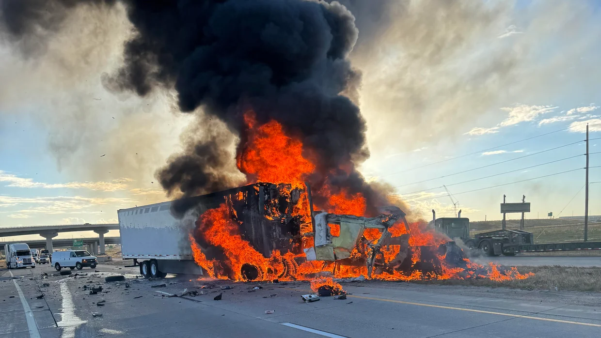 Semi fire shuts down both directions of I-70 near E-470 after crash involving two trucks